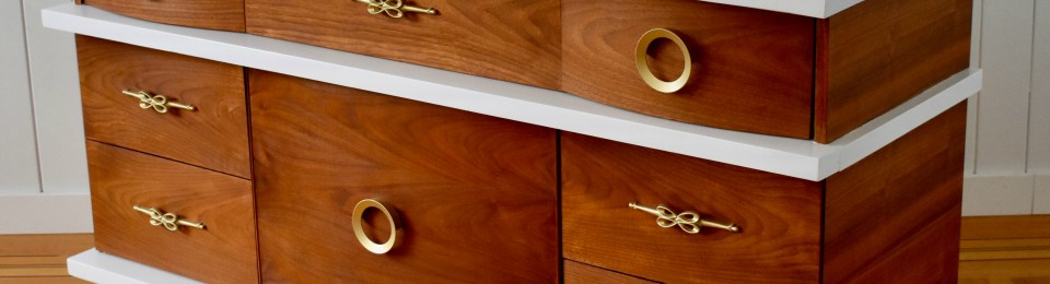 Alex’s dramatic Walnut drawer fronts, sides and pedestal base have been fully restored to highlight their amazing wood grain. Tops and ledges have been painted in crisp white.